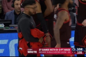 懷特已經(jīng)有27場(chǎng)比賽中至少命中了6記三分球,這一成績(jī)?cè)诠j?duì)歷史上排名第二(僅次于拉文的33場(chǎng))。