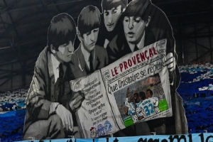 本場(chǎng)比賽馬賽球迷在主場(chǎng)展示出披頭士主題TIFO,披頭士是一支在1960年成立于利物浦的經(jīng)典英國(guó)搖滾樂隊(duì)。