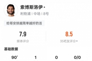 體育資訊1月22日訊 歐冠聯(lián)賽階段第7輪,利物浦3-0戰(zhàn)勝馬賽。索博斯洛伊首發(fā)出戰(zhàn),打進(jìn)1粒進(jìn)球,送出1次關(guān)鍵傳球,還有3次解圍,評分7.9。