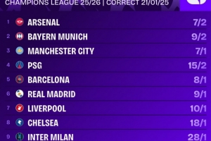體育資訊1月22日訊 歐冠聯(lián)賽階段第7輪比賽戰(zhàn)罷,相關(guān)機構(gòu)給出了歐冠奪冠的最新賠率,阿森納居首,拜仁、曼城、巴黎前四。
