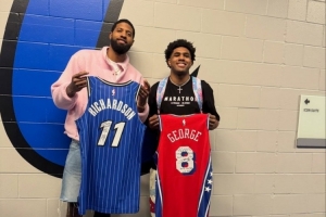 體育資訊1月11日訊 昨日,76人客場103-91擊敗魔術(shù),賽后喬治和魔術(shù)新秀杰斯·理查德森交換球衣并合影。