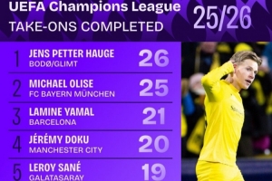體育資訊1月23日訊 數(shù)據(jù)機(jī)構(gòu)Squawka統(tǒng)計(jì)本賽季歐冠球員成功過人次數(shù)榜,海于格26次居首,奧利塞25次第二,亞馬爾21次第三。