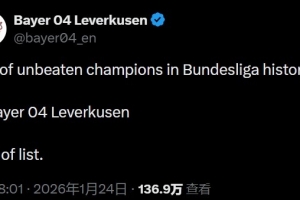 作為德甲歷史上唯一一支不敗奪冠的球隊(duì),勒沃庫(kù)森官方在拜仁比賽結(jié)束后,更新社交媒體寫(xiě)道:“德甲歷史上的不敗冠軍名單:1. 勒沃庫(kù)森。名單結(jié)束。”