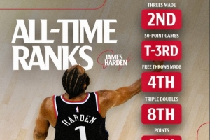 體育資訊1月25日訊 今天,快船官方曬出哈登生涯各項(xiàng)數(shù)據(jù)的歷史排名,詳情如下: