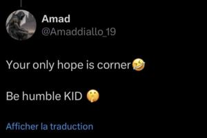 當(dāng)博主回復(fù)“別再發(fā)信息來了”后,阿瑪?shù)掠盅a(bǔ)了一句:“你唯一的希望就是角球了??保持謙遜吧孩子(閉嘴表情)(Your only hope is corner. Be humble KID)