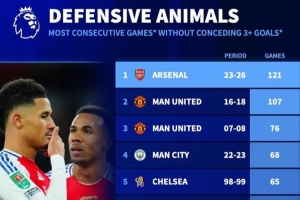英超球隊(duì)各項(xiàng)賽事連續(xù)“單場(chǎng)不丟3球”榜: