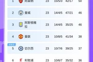 目前英超積分榜上,前六為阿森納、曼城、維拉、曼聯(lián)、切爾西、利物浦。