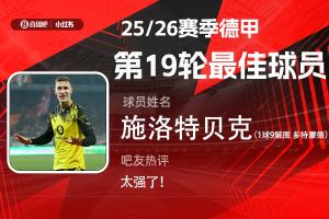 第19輪評選結果出爐,施洛特貝克全場打進1球送出9次解圍,攻防兩端完美發(fā)揮,幫助多特3-0完勝柏林聯(lián)合,當選【體育資訊X小紅書德甲第19輪最佳球員】!