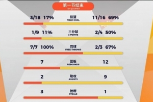 首節(jié)比賽,山東全隊進攻端毫無狀態(tài),內(nèi)外線都不在線,各種打鐵頻出,命中率低到離譜:投籃18投僅3中,三分更是僅9中1。
