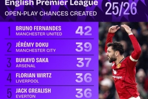 體育資訊1月27日訊 Squawka統(tǒng)計本賽季至今英超球員運(yùn)動戰(zhàn)創(chuàng)造機(jī)會次數(shù),B費(fèi)42次居首,多庫39次第二,薩卡37次第三。