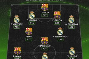 體育資訊1月11日訊 皇馬和巴薩將在本輪西超杯狹路相逢,whoscored也統(tǒng)計了兩隊本賽季西甲評分合體最佳陣,亞馬爾、姆巴佩領(lǐng)銜。