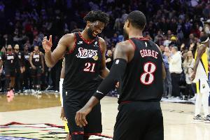 本場(chǎng)比賽恩比德出戰(zhàn)29分鐘,24投11中,三分4中1,罰球6中6,得29分9板(6個(gè)前場(chǎng)籃板)5助1斷;喬治出戰(zhàn)33分鐘,21中11,三分15中9,罰球2中1砍下32分5籃板5助攻2搶斷,正負(fù)值+13。
