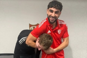 隨后,他又發(fā)了一張照片,照片里他用胳膊夾住了塞維利亞媒體團(tuán)隊的一名成員的脖子。他為這張照片配文:“女士們先生們,我們抓到他了?!?/p>
