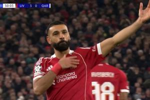 比賽第50分鐘,利物浦任意球索博斯洛伊一踩,薩拉赫左腳轟出世界波,打進非洲杯結(jié)束歸隊后首球,拍胸口利物浦隊徽慶祝!場上比分利物浦3-0卡拉巴赫。