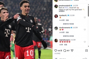 本場比賽穆西亞拉破門,賽后他也在個人社媒曬出本場照片,配文寫道:“回到歐冠取得很棒的勝利,很高興能夠收獲回歸以來的首粒進(jìn)球?!?/p>