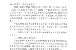足協(xié)官方公布對泰山的處罰決定,2013年至2020年期間,山東泰山違背體育道德、喪失體育精神、為謀取不正當利益進行不正當交易,扣除2026賽季積分6分、罰款人民幣80萬元。