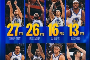 賽后勇士發(fā)布數(shù)據(jù)海報(bào):本場比賽八人得分上雙!