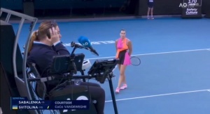 第三局,主裁認(rèn)為薩巴倫卡在擊球過(guò)程中喊叫聲干擾到了斯維托麗娜,所以把這分直接給了對(duì)手。薩巴倫卡申請(qǐng)視頻回放挑戰(zhàn),但也沒(méi)有成功。