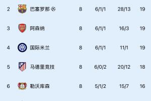 今年歐冠聯(lián)賽階段前8名