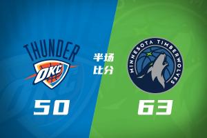 體育資訊1月30日訊 NBA常規(guī)賽,森林狼半場(chǎng)63-50領(lǐng)先雷霆。