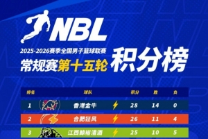 【積分榜】2025-2026賽季NBL常規(guī)賽積分榜(截至第十五輪結(jié)束)