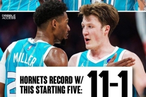 據(jù)統(tǒng)計(jì),黃蜂使用拉梅洛·鮑爾、布蘭登·米勒、克尼佩爾、布里奇斯、迪亞巴特這套首發(fā)的戰(zhàn)績(jī)?yōu)轶@人的11勝1負(fù)。