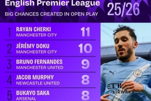 本賽季英超運動戰(zhàn)創(chuàng)造重大機(jī)會榜: