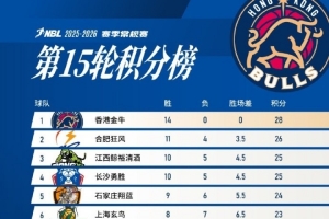 NBL常規(guī)賽第15輪戰(zhàn)罷,香港金牛在少賽一場的情況下,憑借14連勝的戰(zhàn)績,積28分繼續(xù)位列積分榜首位,也仍是聯(lián)盟唯一保持不敗的球隊。