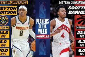 體育資訊1月13日訊 今日NBA官方宣布,掘金隊的沃特森和猛龍球星巴恩斯分獲西部和東部周最佳球員。