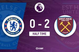 上半場傷停補(bǔ)時5分鐘,半場結(jié)束,切爾西暫0-2西漢姆聯(lián)。