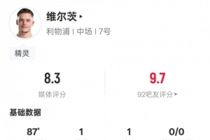 體育資訊2月1日訊 英超第24輪,利物浦主場迎戰(zhàn)紐卡斯?fàn)?,維爾茨首發(fā)出戰(zhàn),傳射建功,還送出2次關(guān)鍵傳球,3次解圍,評分8.3。