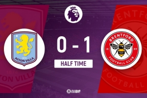 傷停補(bǔ)時(shí)4分鐘。上半場比賽結(jié)束,阿斯頓維拉0-1布倫特福德。