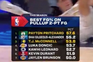 急停跳投兩分球命中率,普里查德57.6%,力壓亞歷山大排名第一。