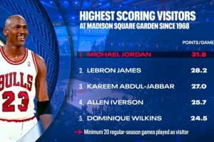 湖人客場挑戰(zhàn)尼克斯,轉(zhuǎn)播方給出麥迪遜客場球員場均得分榜(至少打20場):