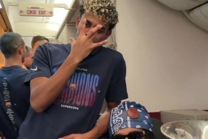 巴薩官方更新社媒動態(tài),曬出亞馬爾等球員在飛機(jī)內(nèi)與獎杯合影的視頻和照片,慶祝球隊奪冠。