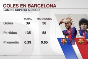 據(jù)ESPN統(tǒng)計,18歲亞馬爾已經(jīng)為巴薩打進(jìn)39球,巴薩生涯進(jìn)球數(shù)量超越馬拉多納(38球)。