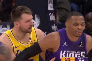 GIF-東契奇回身撞到威少 輕拍后者友好示意