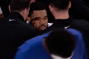 GIF-唐斯突破對抗斯潘塞·瓊斯,二人都流血,唐斯眉骨被打破,貼創(chuàng)可貼罰球后回更衣室處理