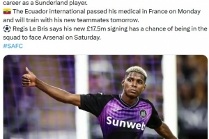 報道稱這位厄瓜多爾國腳周一在法國通過了體檢,并將于明天與新隊友一起訓練。主教練雷吉斯·勒布里斯表示,這位球隊1750萬英鎊引進的新援有可能在周六對陣阿森納的比賽中進入大名單。