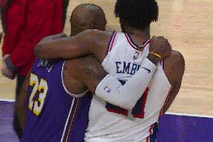 里夫斯沖過(guò)來(lái)和八村塁相擁~!??!詹姆斯和恩比德也抱在一起~?。?!