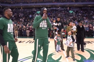 體育資訊2月7日訊 在今日雄鹿對(duì)陣步行者的賽前。波蒂斯攜手字母哥哥向字母哥致敬,并祝他連續(xù)10次進(jìn)入全明星陣容。