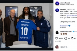 葡萄牙邊鋒萊奧造訪兒時(shí)母隊(duì)阿莫拉,并獲贈(zèng)阿莫拉10號(hào)球衣,俱樂(lè)部官方社媒曬出照片,配文:“好孩子總會(huì)回家,今天我們有幸接待了萊奧,他對(duì)這里再熟悉不過(guò)了,感謝你的來(lái)訪!”