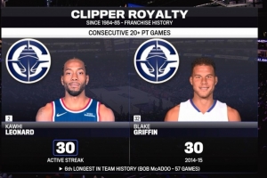 快船隊(duì)史連續(xù)20+紀(jì)錄是鮑伯·麥卡杜保持的57場(chǎng)