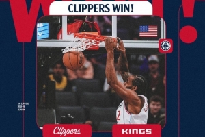 賽后,快船官方發(fā)布贏球海報,倫納德雙手扣籃的瞬間上封面。