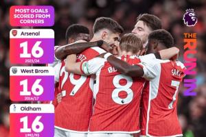 槍手目前距離英超單賽季角球進球最高紀(jì)錄只差2球,該紀(jì)錄現(xiàn)為16球,由1992-93賽季的奧德漢姆、2016-17賽季的西布朗以及2023-24賽季的阿森納共同保持。