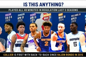 過去5個賽季打滿48分鐘的球員:奇才約翰遜和爵士基昂特·喬治在2025年4月13日打滿;尼克斯麥克布萊德在2024年3月23日打滿;尼克斯哈特在2024年3月18日打滿;灰熊文斯·威廉姆斯在2023年4月9日;雷霆卡萊察基斯2022年4月10日打滿。