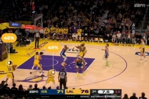 轉(zhuǎn)播方回放詳解湖人第三節(jié)最后一攻,詹姆斯突分八村塁三分命中。