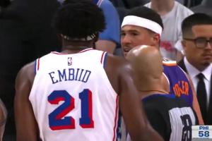 布克回頭噴恩比德:“我打的全是球,尼格。全是球,尼格?!?/p>