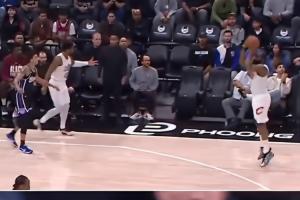 終場前2分多鐘,騎士反擊,米切爾回傳助攻哈登命中空位三分反超比分。在哈登投進這球之前,米切爾已經(jīng)提前慶祝了。