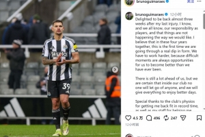 吉馬良斯此役傷愈復(fù)出,為紐卡踢滿全場(chǎng),并點(diǎn)射破門,賽后他在社交媒體上寫道:“時(shí)隔近三周傷愈復(fù)出,我感到很高興。我們球員都深知肩負(fù)的責(zé)任,也明白現(xiàn)狀未達(dá)預(yù)期。我們并肩作戰(zhàn)的這四年里,這是我們第一次真正經(jīng)歷狀態(tài)低谷。我們必須更加努力,因?yàn)槠D難時(shí)刻往往是讓我們變得比以往更好的契機(jī)。